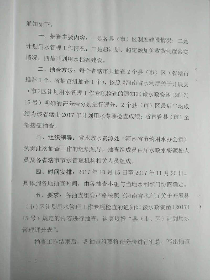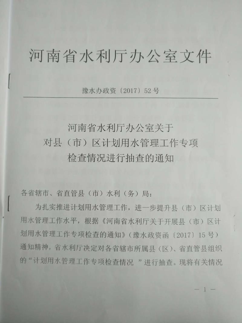 河南省水利厅办公室关于对县(市)区计划用水管理工作专项检查情况进行抽查的通知