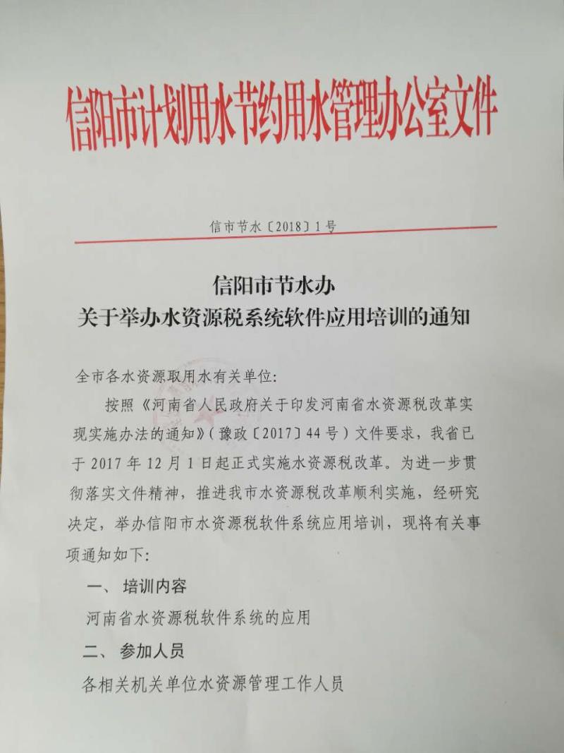 信阳市节水办关于举办水资源税系统软件应用培训的通知