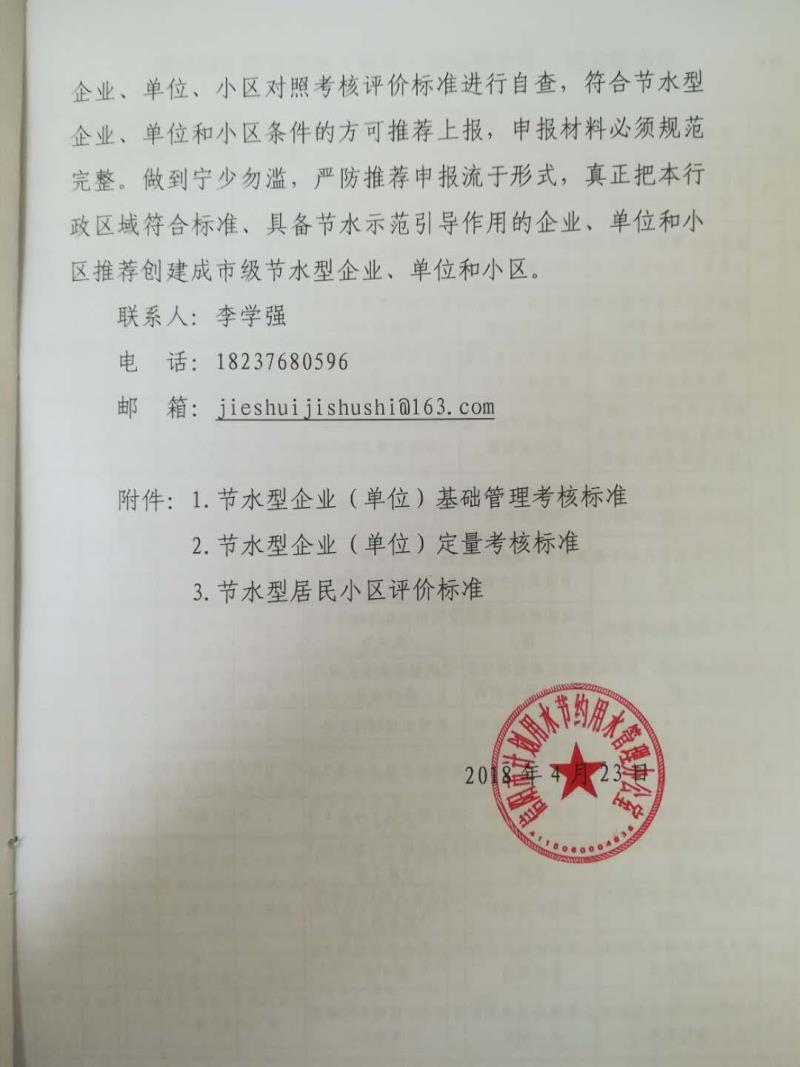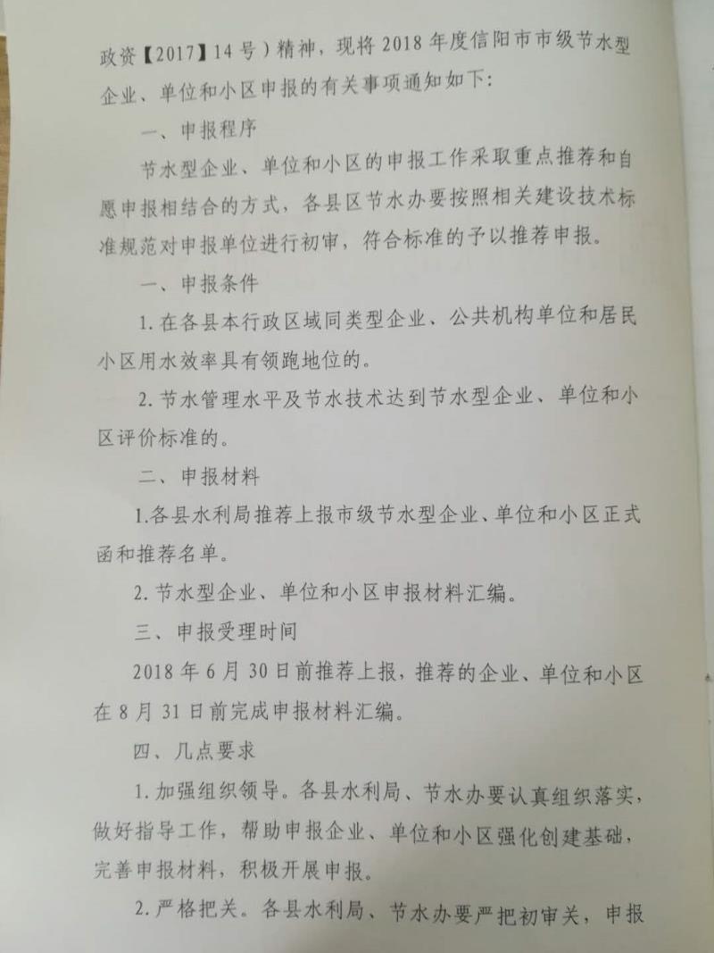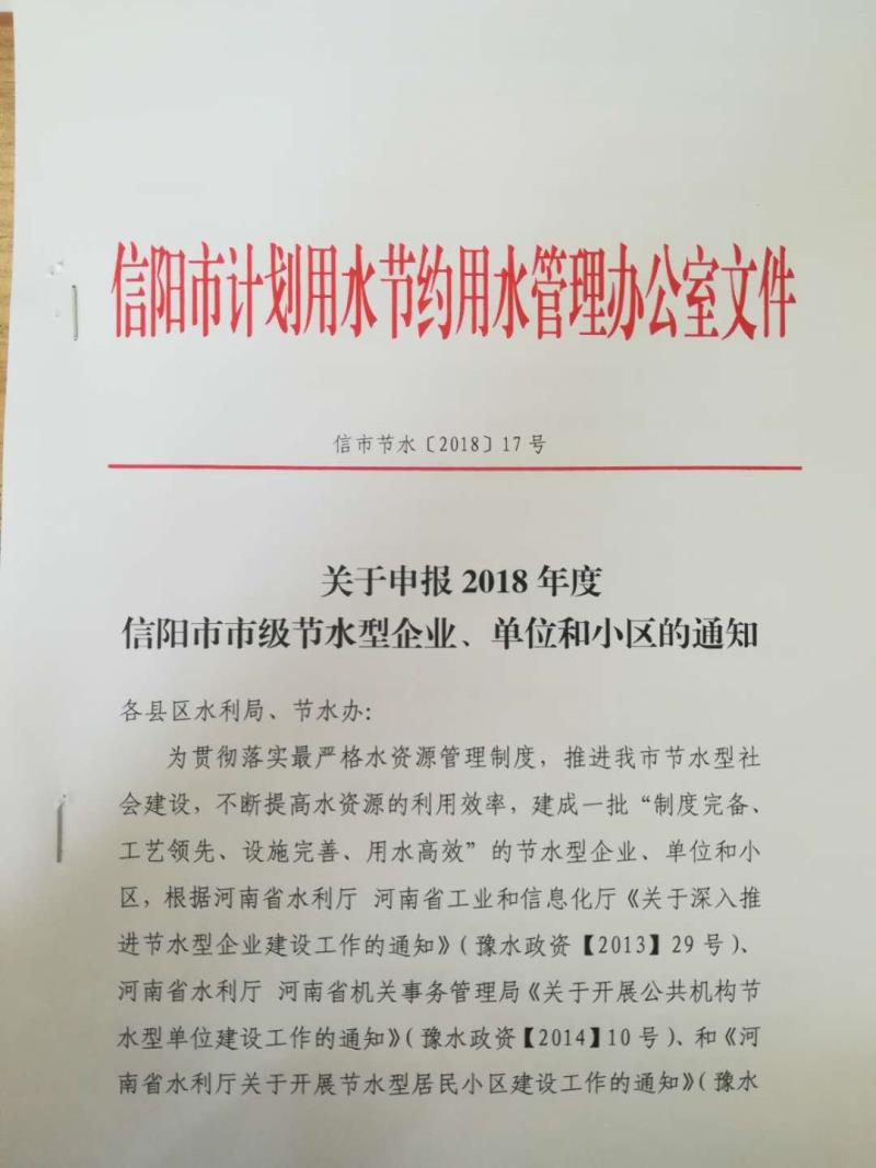 关于申报2018年度信阳市市级节水型企业、单位和小区的通知