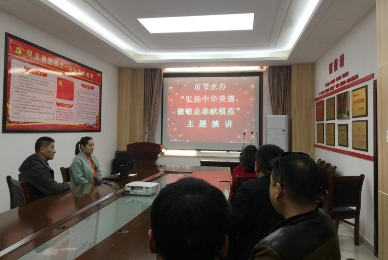 在党的十九大召开以来,市节水办党支部班子带领全办人员,紧紧围绕习总书记新时期治水方针开展全办各项工作,为培养全办干部职工爱岗敬业、无私奉献精神,11月13日下午,市节水办举办了“弘扬中华美德,做敬业奉献模范”主题演讲活动。