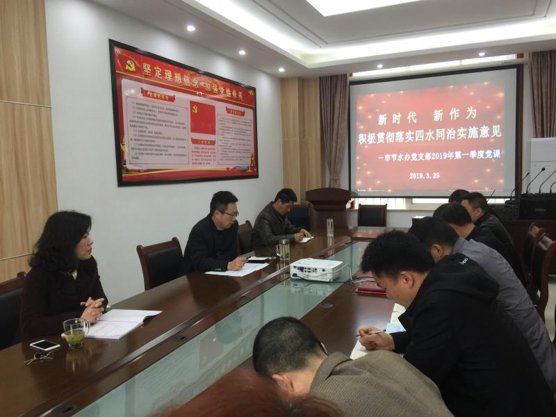 3月28日上午,市节水办党支部举办2019年第一季度支部书记讲党课。全办在职党员参加了党课教育。市节水办党支部书记、主任张军以“新时代、新作为、积极贯彻落实四水同治实施意见”为主题,围绕新时代下如何转变观念,紧跟新形势,继续发挥党员先锋模范作用积极取得新作为,给同志们上了一堂内容丰富的党课。