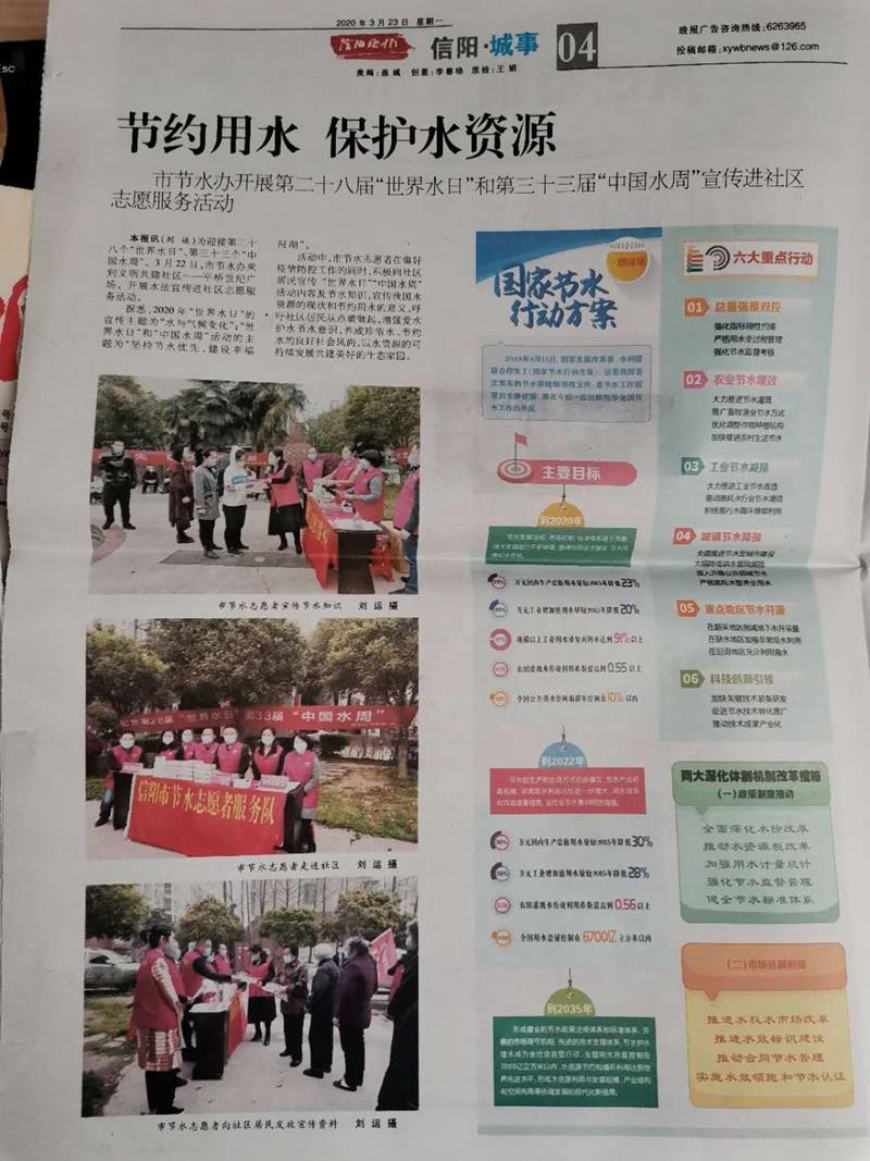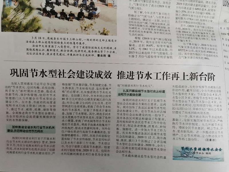 3.线上线下水法宣传服务活动。中心干部职工通过朋友圈转发宣传节水知识;部分干部职工参加水利部组织的网上水法规知识大赛;向信阳晚报发送信息宣传、发放宣传资料、利用LED显示屏幕滚动播放宣传标语、悬挂宣传横幅等形势多样的宣传方式,向广大人民群众宣传节水护水、节水型社会创建、水土保持法、河长制等知识和法律法规。