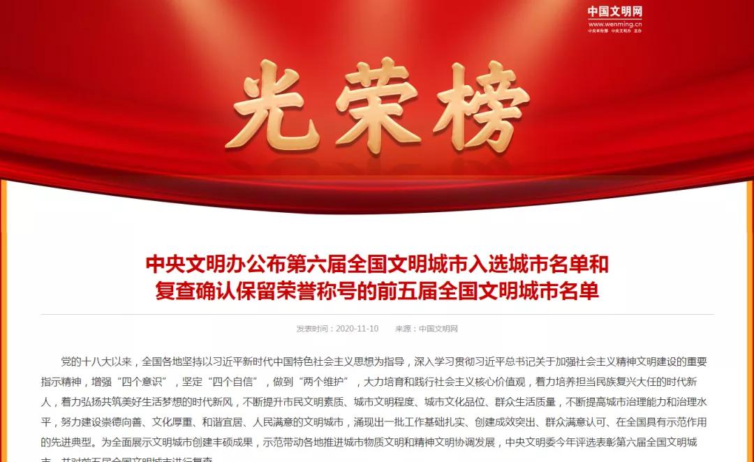党的十八大以来,全国各地坚持以习近平新时代中国特色社会主义思想为指导,深入学习贯彻习近平总书记关于加强社会主义精神文明建设的重要指示精神,增强“四个意识”,坚定“四个自信”,做到“两个维护”,大力培育和践行社会主义核心价值观,着力培养担当民族复兴大任的时代新人,着力弘扬共筑美好生活梦想的时代新风,不断提升市民文明素质、城市文明程度、城市文化品位、群众生活质量,不断提高城市治理能力和治理水平,努力建设崇德向善、文化厚重、和谐宜居、人民满意的文明城市,涌现出一批工作基础扎实、创建成效突出、群众满意认可、在全国具有示范作用的先进典型。为全面展示文明城市创建丰硕成果,示范带动各地推进城市物质文明和精神文明协调发展,中央文明委今年评选表彰第六届全国文明城市,并对前五届全国文明城市进行复查。2020年8月以来,中央文明办按照城市自主申报、省级择优推荐、中央部委审核、媒体集中公示、组织综合测评、确定入选城市等评选办法和程序,严谨规范组织第六届全国文明城市评选工作,严格依据参评城市2018、2019、2020年三年测评总成绩排名,提出第六届全国文明城市入选城市名单,报中央文明委领导同志批准。同时,中央文明办按照城市自查、省级审核、中央把关、组织测评等复查办法和程序,认真做好前五届全国文明城市复查工作,严格依据全国文明城市复查测评成绩,提出继续保留荣誉称号的全国文明城市名单,报中央文明委领导同志批准。现将第六届全国文明城市入选城市名单和复查确认保留荣誉称号的前五届全国文明城市名单公布如下。