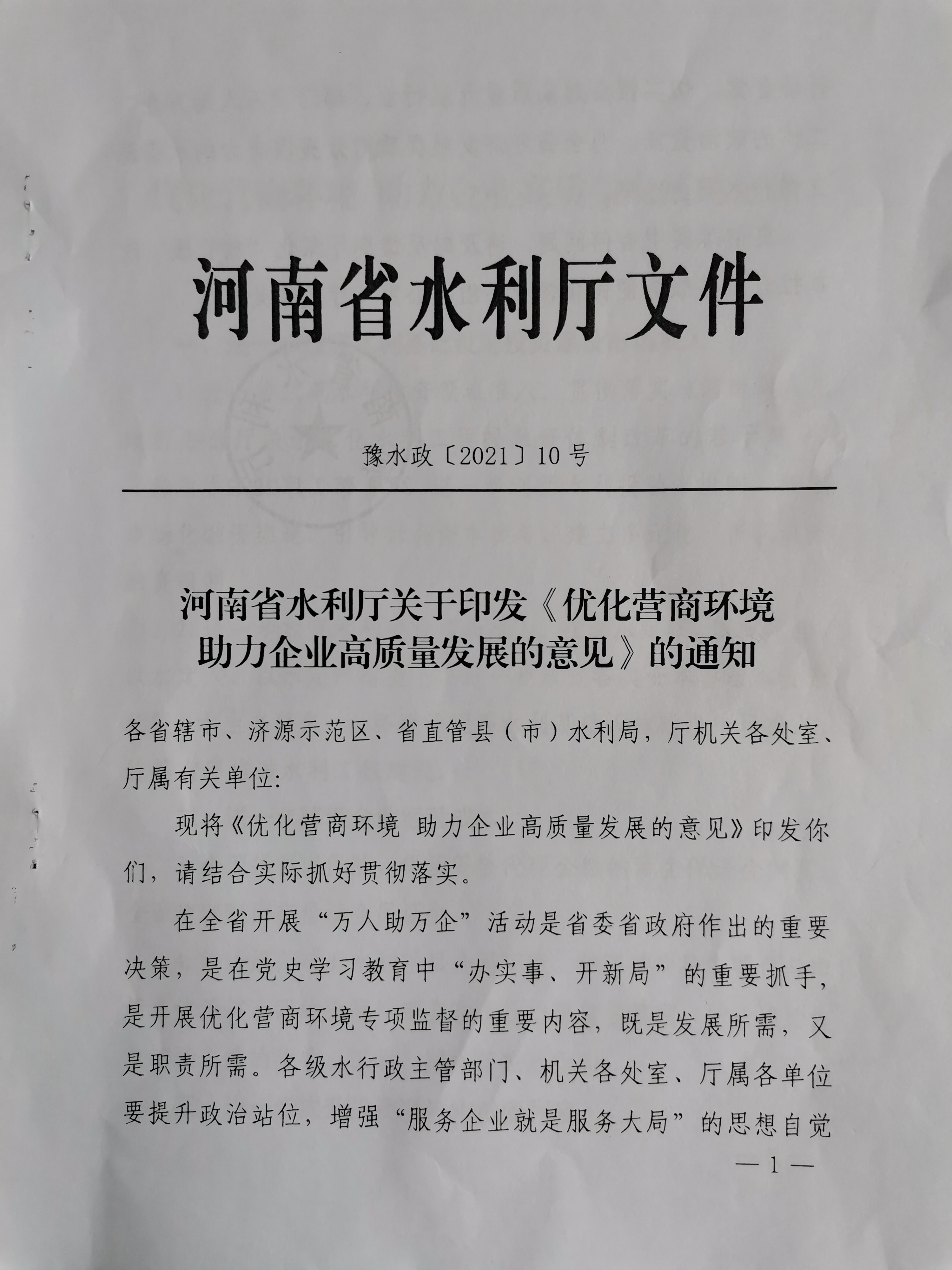 河南省水利厅关于印发《优化营商环境助力企业高质量发展的意见》的通知