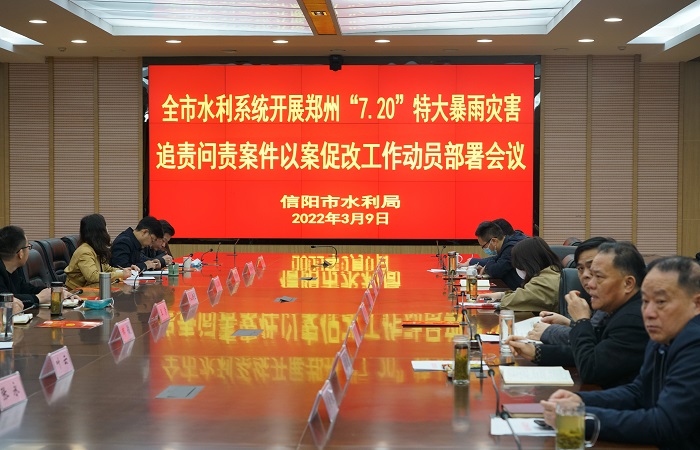 会议要求,全市水利系统要全面对照中央、省、市关于集中开展郑州“7.20”特大暴雨灾害追责问责案件以案促改工作的相关要求,严字当头、实字托底,真抓真做、真查真改,为谱写“美好生活看信阳”水利篇章,打造信阳水利系统风清气正的政治生态提供坚强纪律保证。一要提升政治站位,充分认识做好这次以案促改工作的重要意义,切实认清开展此次以案促改工作的重要性、必要性和紧迫性。二要深刻汲取教训,扎实推进以案促改各项任务落实落地。要精心组织,广泛动员部署;深挖细剖,找准问题根源;制定措施,突出问题整改;细化举措,补齐短板弱项。三要强化责任担当,加强组织领导,层层压实责任,严格督查问效,确保以案促改工作取得扎实成效。