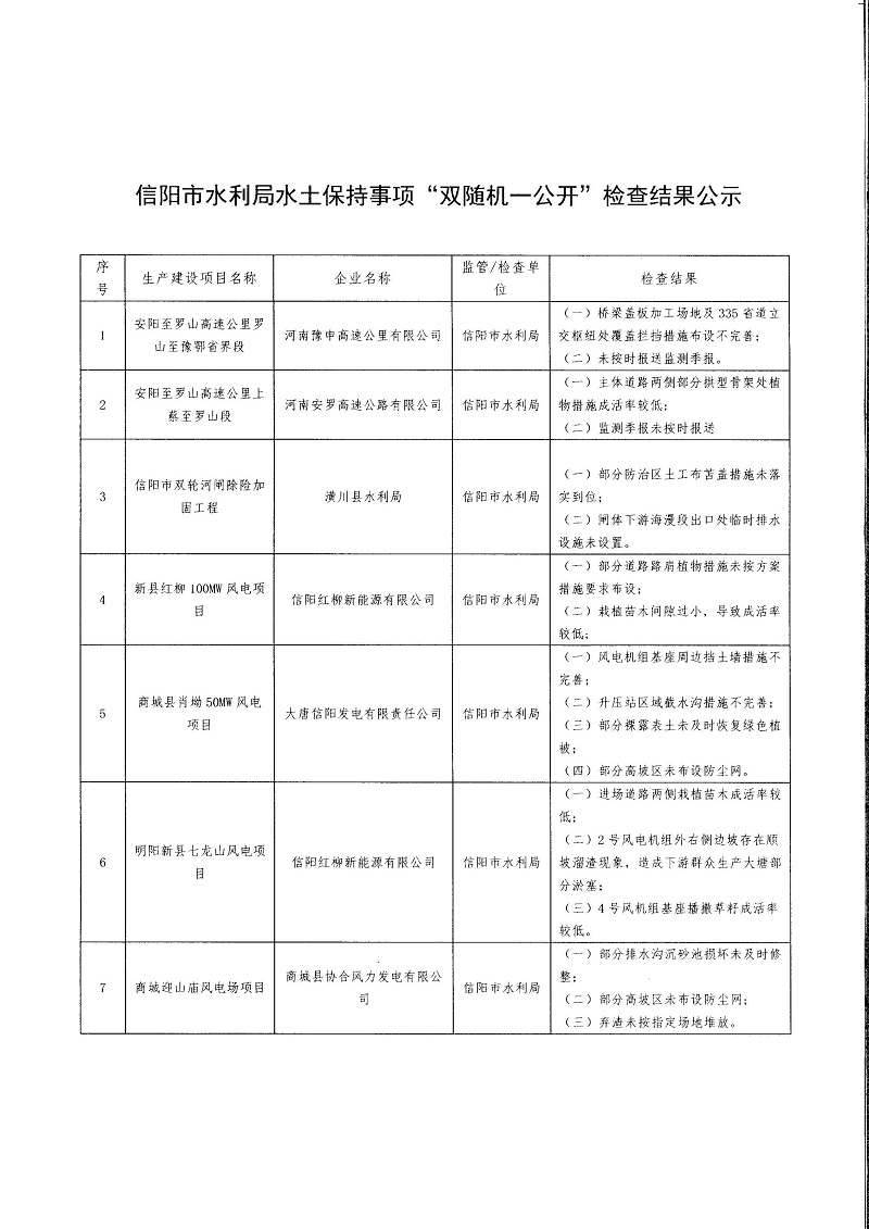 为贯彻《国务院办公厅关于推广随机抽查规范事中事后监管的通知》(国办发〔2015〕58号),2022年5月11日,按照《河南省生产建设项目水土保持监督检查管理办法(试行)》的通知(豫水保〔2019〕20号)及信阳市水利局《关于开展2022年度第一季度生产建设项目水土保持“双随机、一公开”抽查检查》的通知(信水保函〔2022〕1号)规定的抽查主体、对象和抽查比例,市水利局组织对安阳至罗山高速公路罗山至豫鄂省界段、信阳市双轮河闸除险加固工程等水土保持方案实施情况开展随机抽查工作,现将抽查结果公示如下: