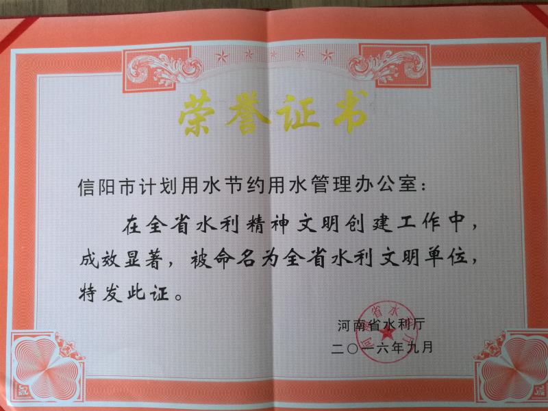 2016年9月,信阳市节水办被河南省水利厅授予“全省水利文明单位”荣誉称号。