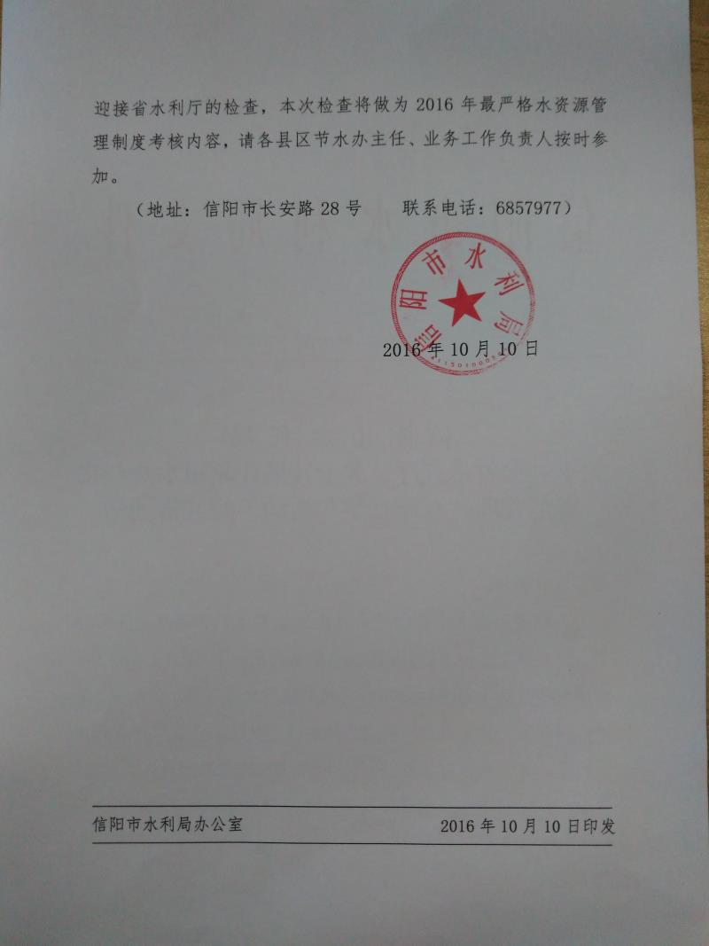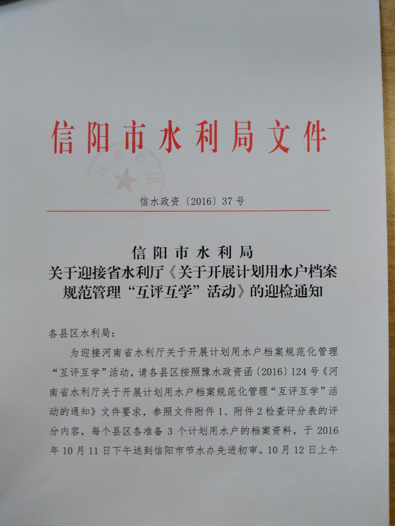 信阳市水利局关于迎接省水利厅《关于开展计划用水户档案规范管理“互评互学”活动》的迎检通知