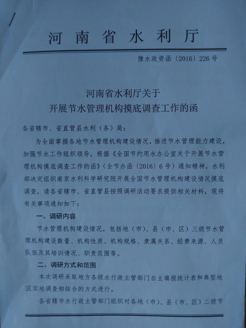 河南省水利厅关于开展水管理机构摸底调查工作的函