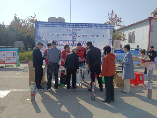 组织节水志愿者进入信阳市贸易广场社区、合惠园社区开展2024年“节水中国行”主题宣传活动。志愿者们向社区居民科普我市基本水情、节约用水基本知识、节约用水方针政策与法律法规。市民在聆听讲解、观看展板及宣传页等方式学习节水知识,树立节水理念。